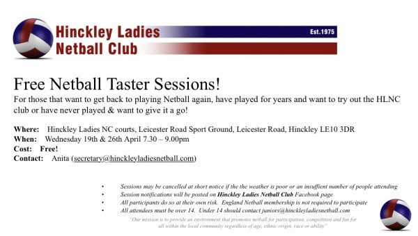 The sessions will be held at the Hinckley Ladies Netball courts at the Leicester Road Sports Ground, Leicester Road, Hinckley LE10 3DR